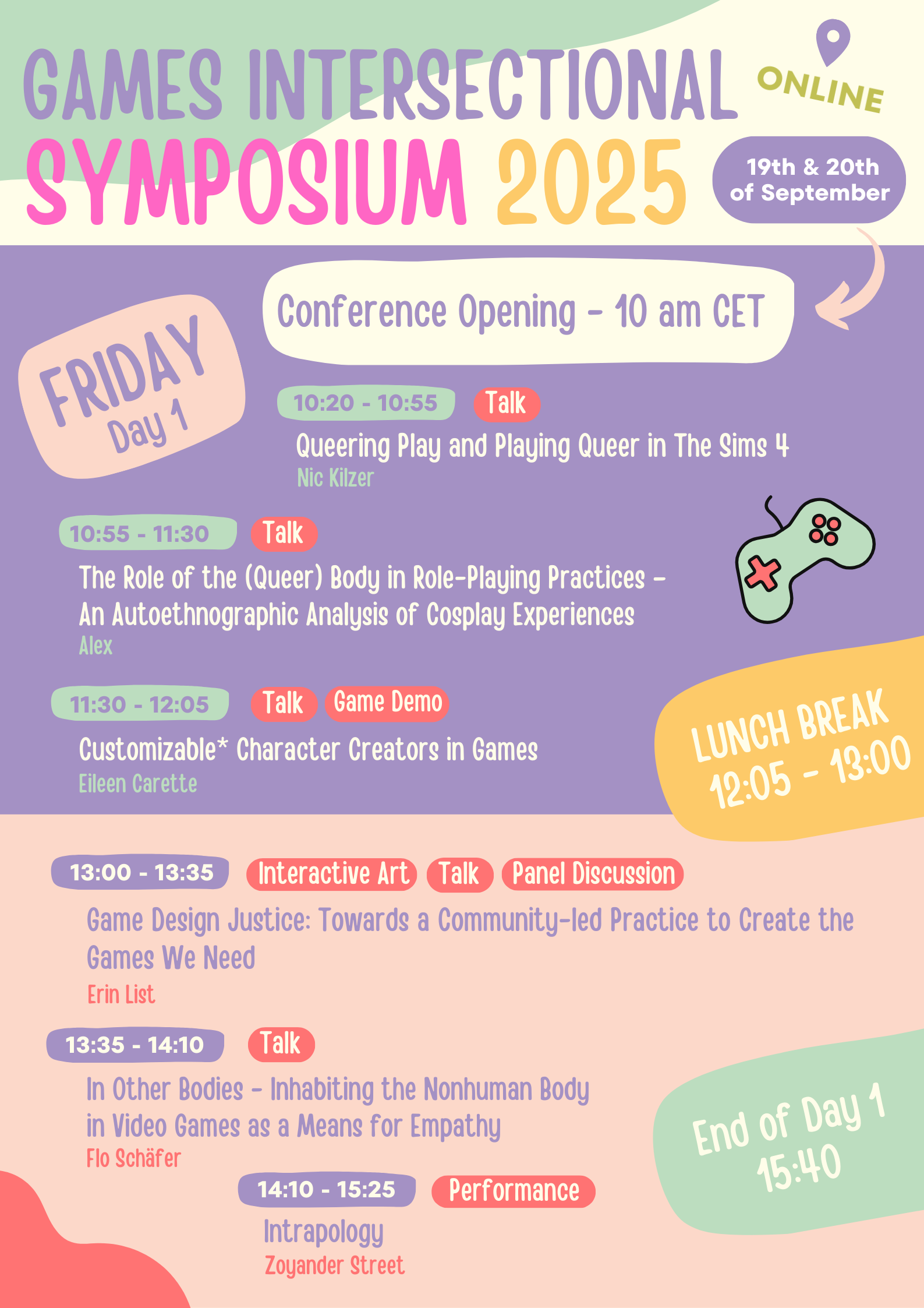 Day 1 poster: Games Intersectional Symposium 2025, Friday schedule with sessions from 10:00 to 15:40 including talks by Nic Kilzer, Alex; demo by Eileen Carette; talk by Flo Schäfer; performance Intrapology by Zoyander Street.