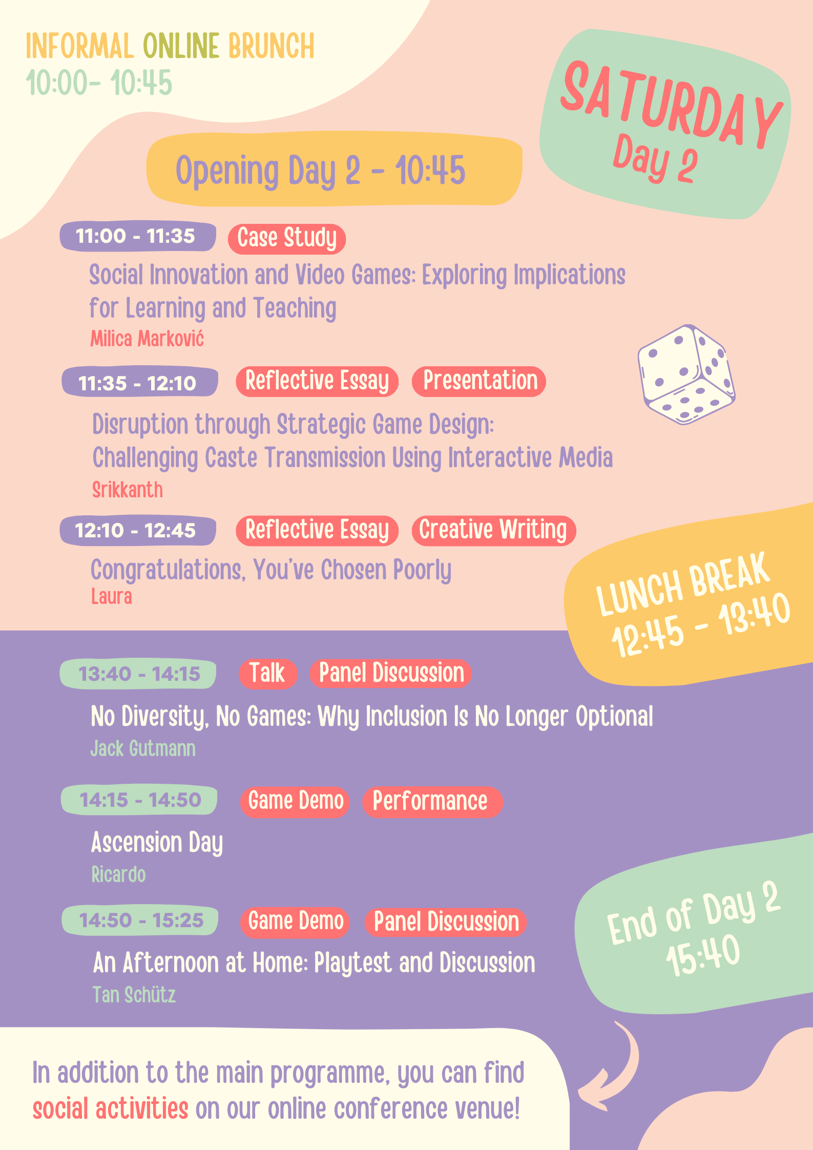 Day 2 poster: Saturday schedule with brunch at 10:00; sessions by Milica Marković, Srikanth, Laura, Jack Gutmann, Ricardo; and Tan Schütz; end at 15:40.